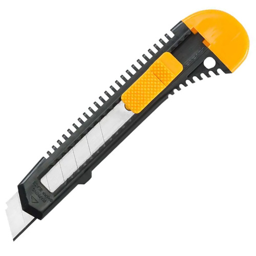 Применяется для разрезания бумаги, картона и прочих материалов, рез которых не требует специальных усилий.Имеет пластмассовый корпус, кнопки выдвижения и фиксации сегментированного сменного лезвия шириной 18 мм, замена которого осуществляется вручную через хвостовую часть ножа.